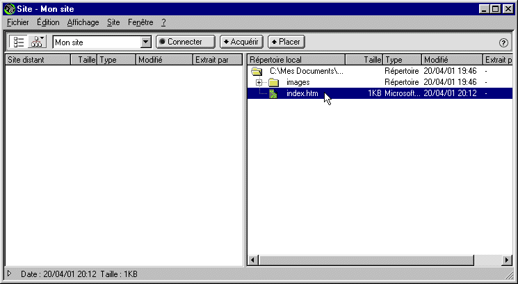 On utilisera essentiellement la partie droite de la fenêtre Site :