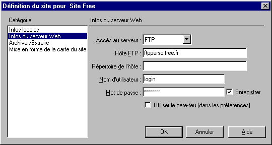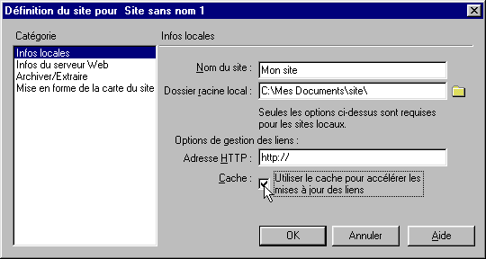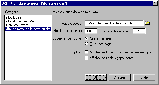| Dans la fenêtre index.htm : - menu Fichier, Nouveau site..., Dans la fenêtre "Définition du site pour..." : Catégorie Infos locales (écran