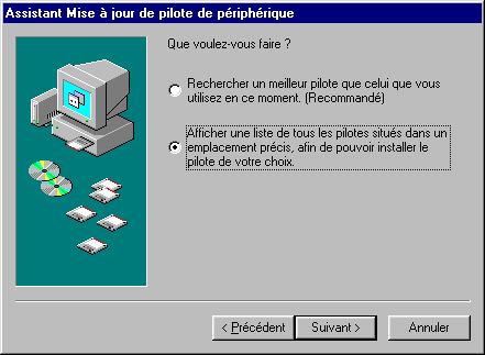 - ouvrir le Gestionnaire de périphérique, PS : Lorsque le pilote de périphérique est à l'intérieur d'un cd-rom, il faudra rechercher le dossier contenant la bonne version de celui-ci : langue (français) et système d'exploitation (Windows : W9x). |
